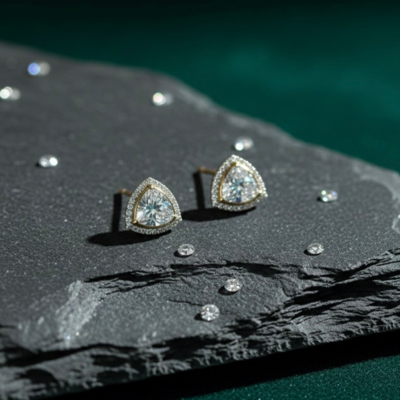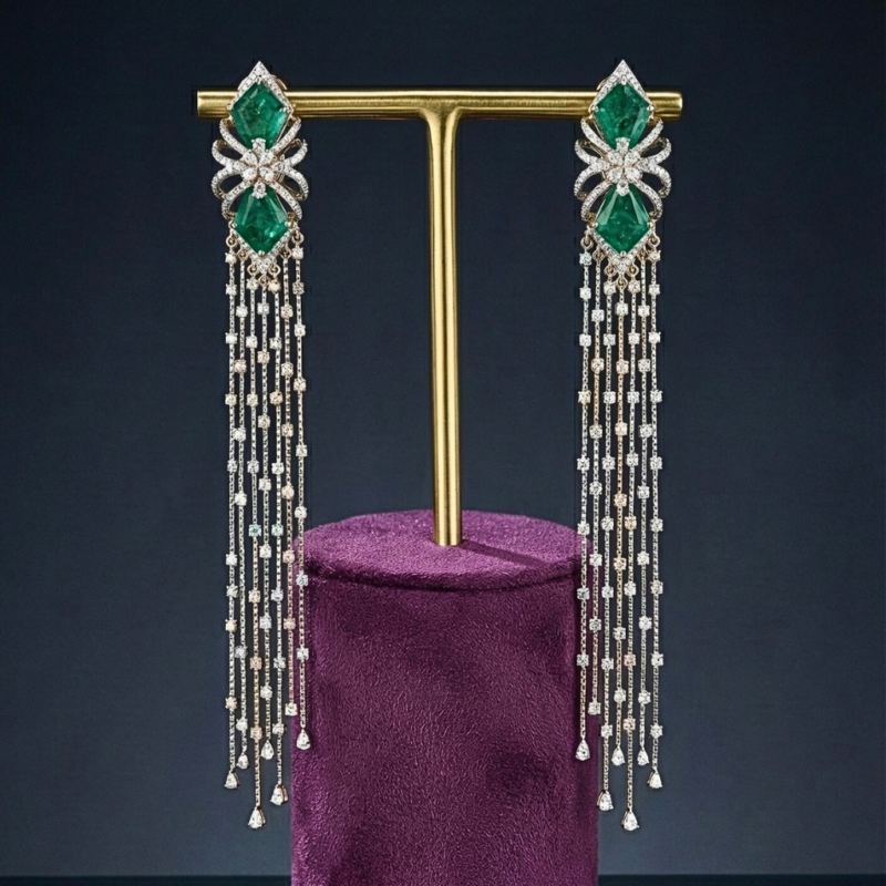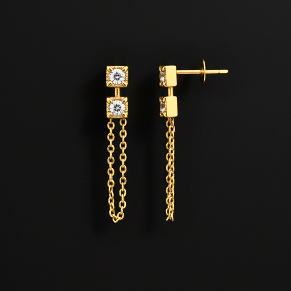 Double the sparkle, double the charm. These chic studs feature two diamond-set squares stacked in perfect harmony, finished with delicate gold chains that sway with every move. A modern, playful twist on classic elegance.