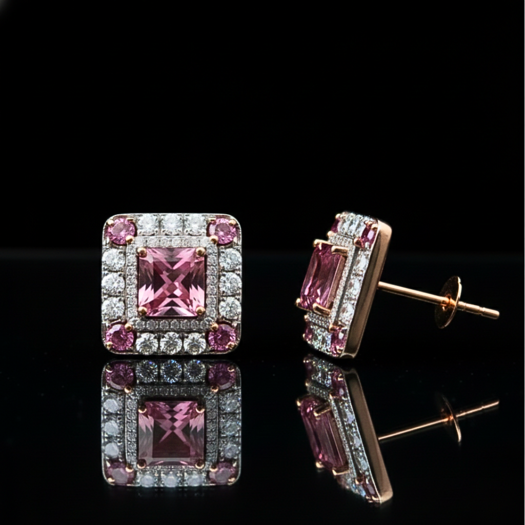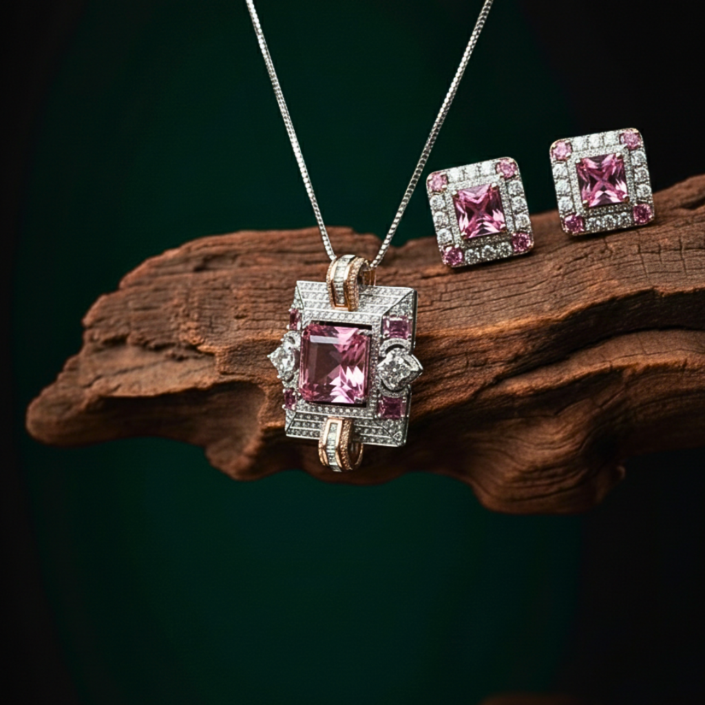 ‘Gulnaar’ means Pink/Rose, celebrating the striking color of the piece. A striking balance of bold color and classic brilliance. This set features a vivid pink center stone framed by a crisp, geometric diamond halo, capturing the essence of a modern royal romance. It is the perfect pop of color for the woman who rules with a gentle heart.