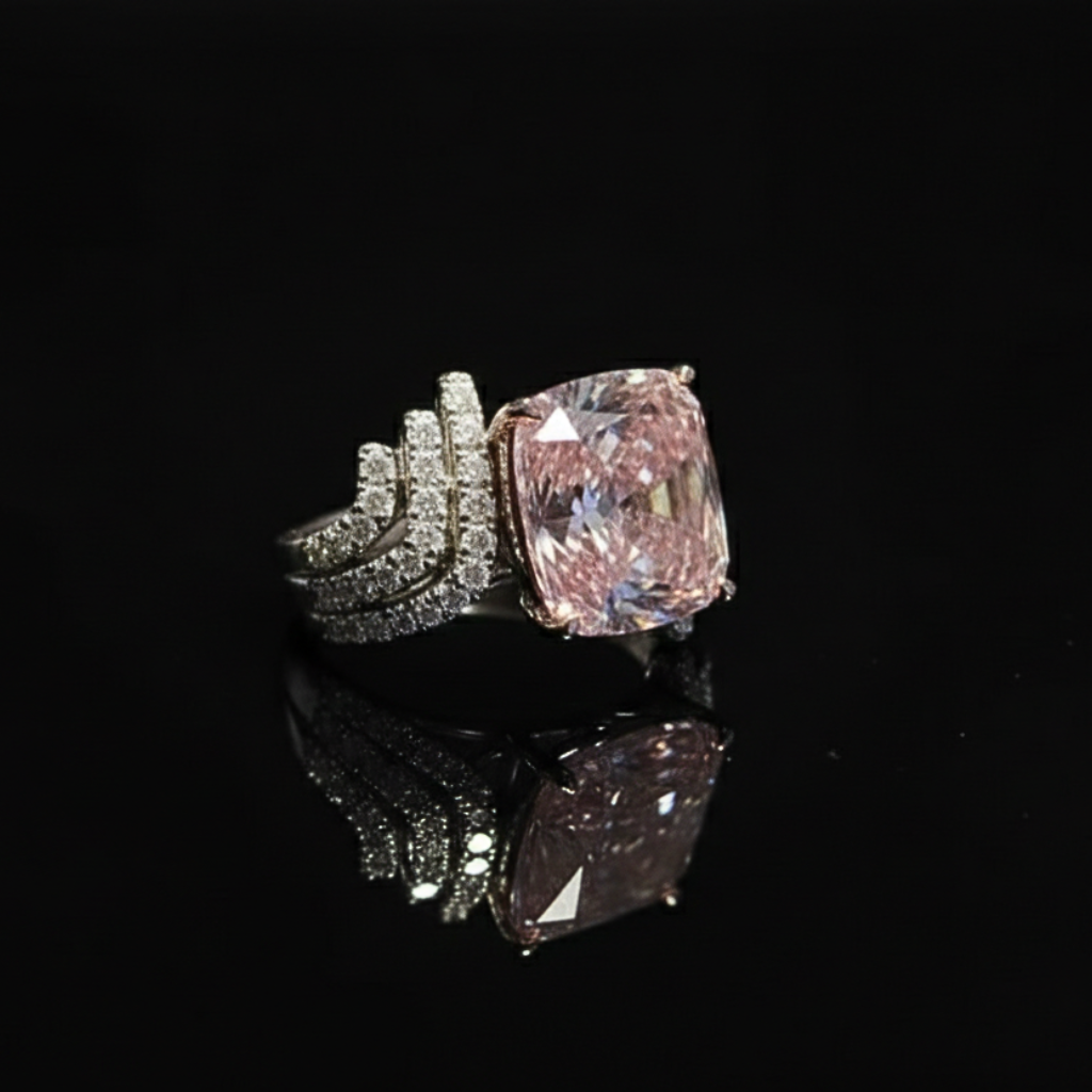 ‘Nazm’ means A Piece of Poetry, fitting the soft, romantic, and lyrical design of this ring. A delicate piece of visual poetry. This ring features a soft, voluminous pink cushion-cut center, embraced by sweeping diamond-encrusted bands that resemble the wings of a royal swan. It is a romantic, dream-like treasure that captures the heart at first glance.