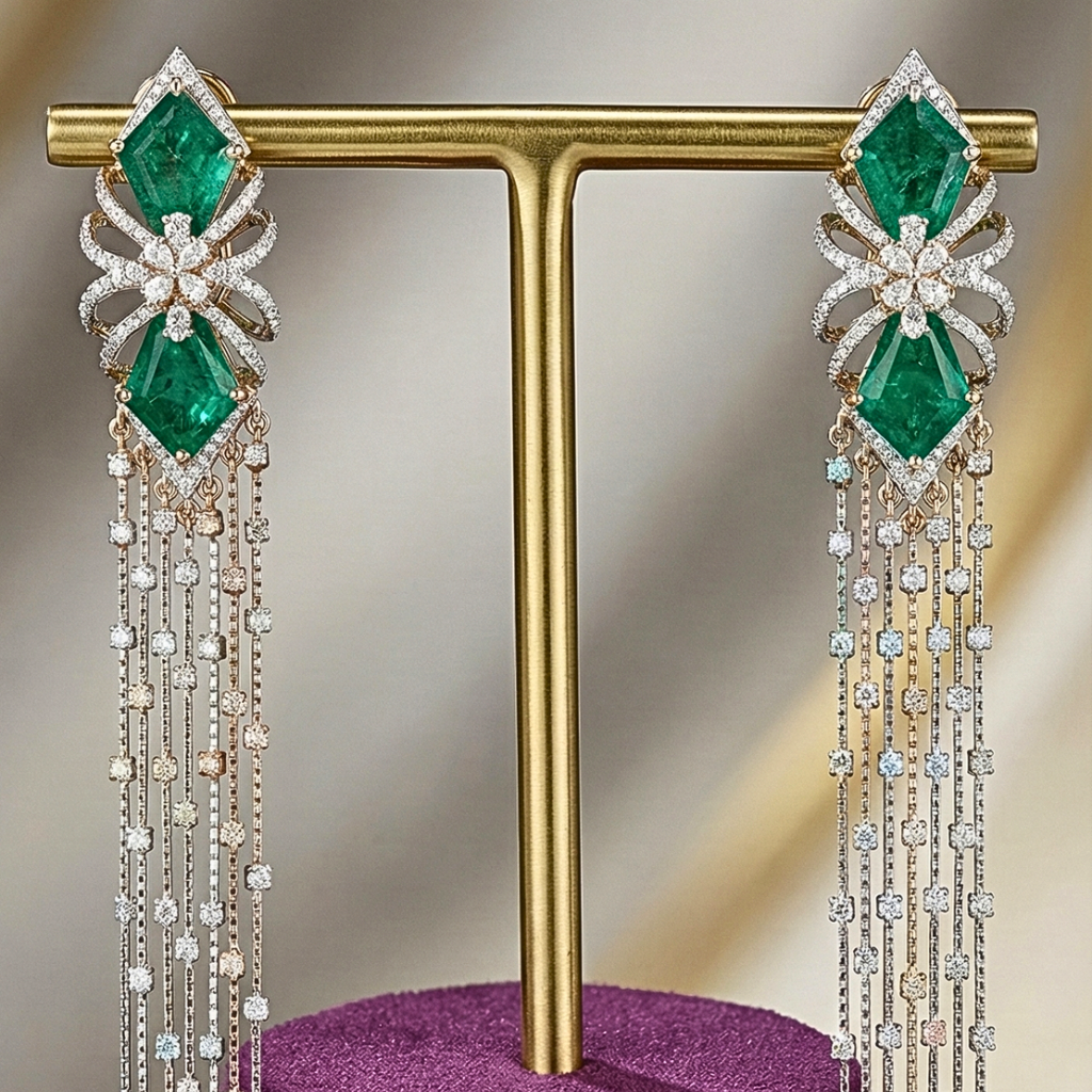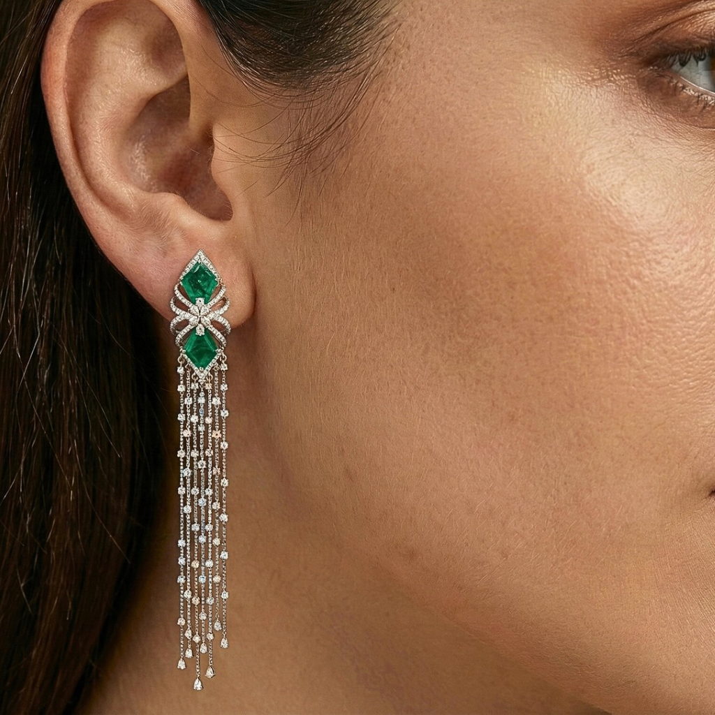 A mesmerizing cascade of light and color, these earrings are designed to move with you. The regal emerald green heart is crowned by brilliant stones and finished with elegant natural diamond tassels that shimmer like a chandelier. A dramatic, royal statement for nights when you want to leave a lasting impression.