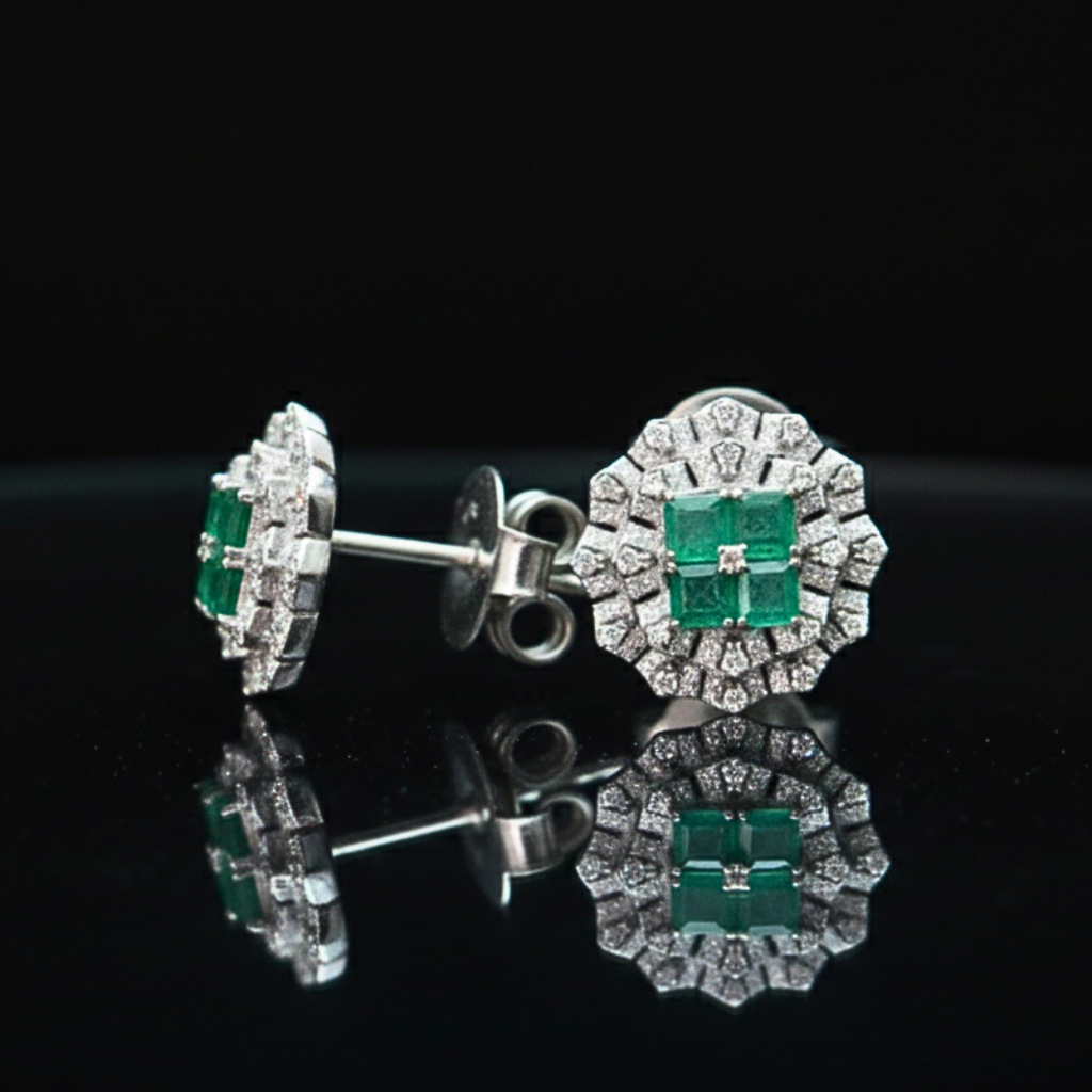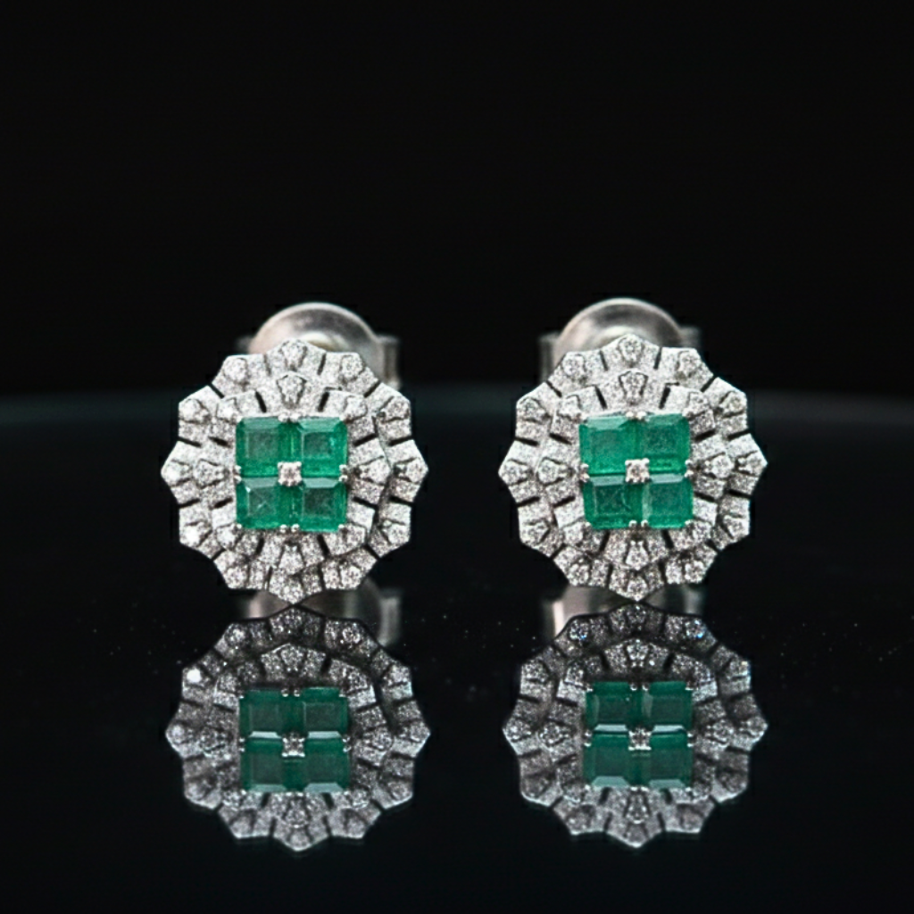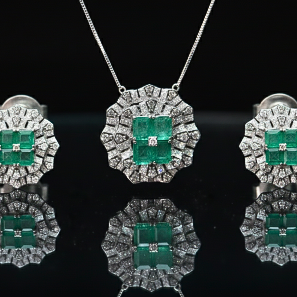 ‘Panna’ means Emerald, highlighting the central green stones. A geometric marvel fit for a dynasty. Featuring a rich, vivid cluster of emeralds surrounded by an intricate diamond halo, this set radiates commanding authority and timeless grace. It is a bold heirloom piece for the modern era.