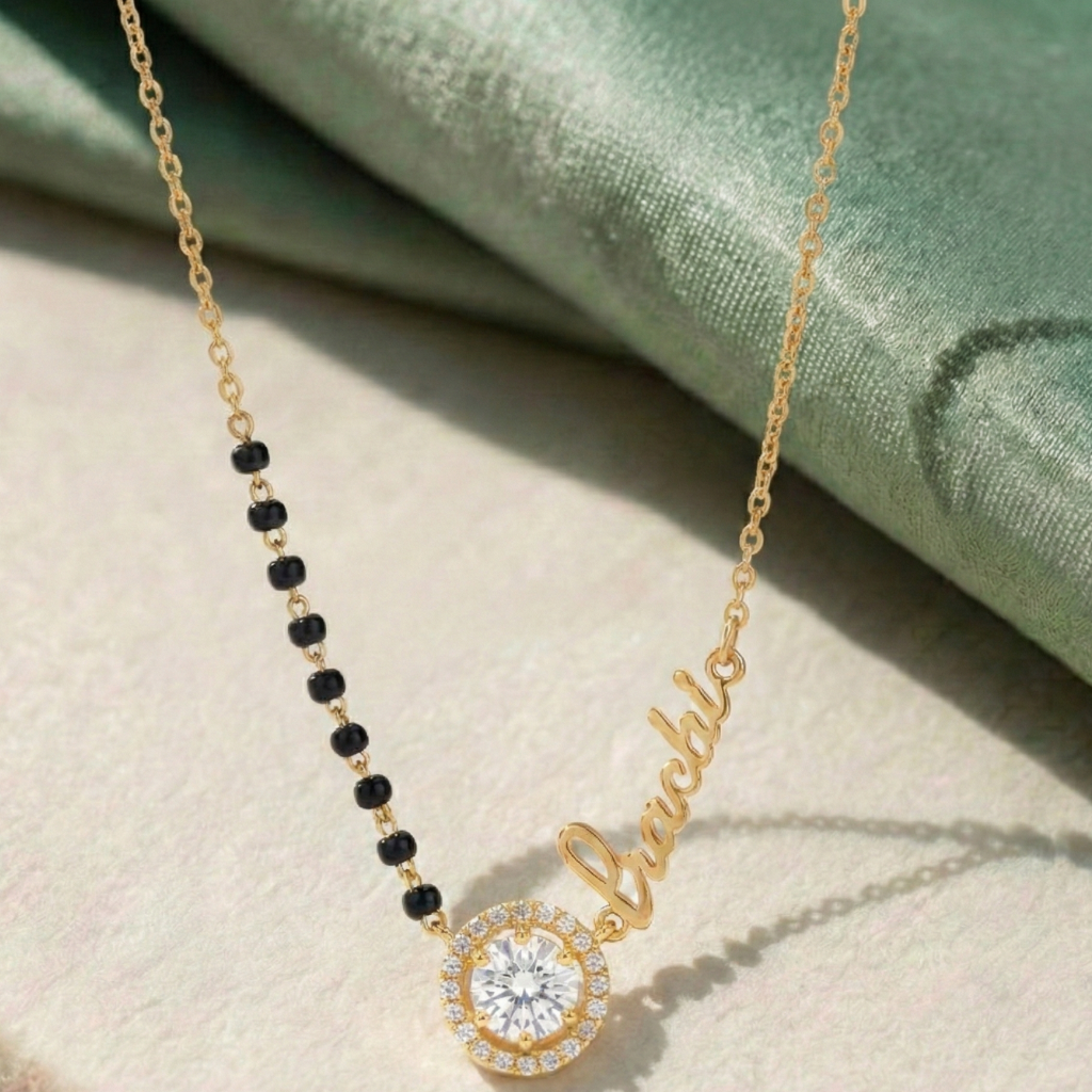 ‘Pehchan’ means Identity, celebrating the name you carry. Your name, your story, your sparkle. This bespoke design seamlessly blends a personalized name script with a radiant solitaire halo. It is more than just jewelry; it is a signature piece that honors your identity within the sacred thread of love.