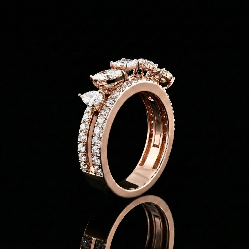 A seamless thread of gems, this band weaves together a sequence of mixed diamond shapes—pears, rounds, and princess cuts—set in lustrous rose gold. The “Ratan-Sutra” represents a bond that is diverse yet unified, perfect for celebrating the many beautiful facets of your life.