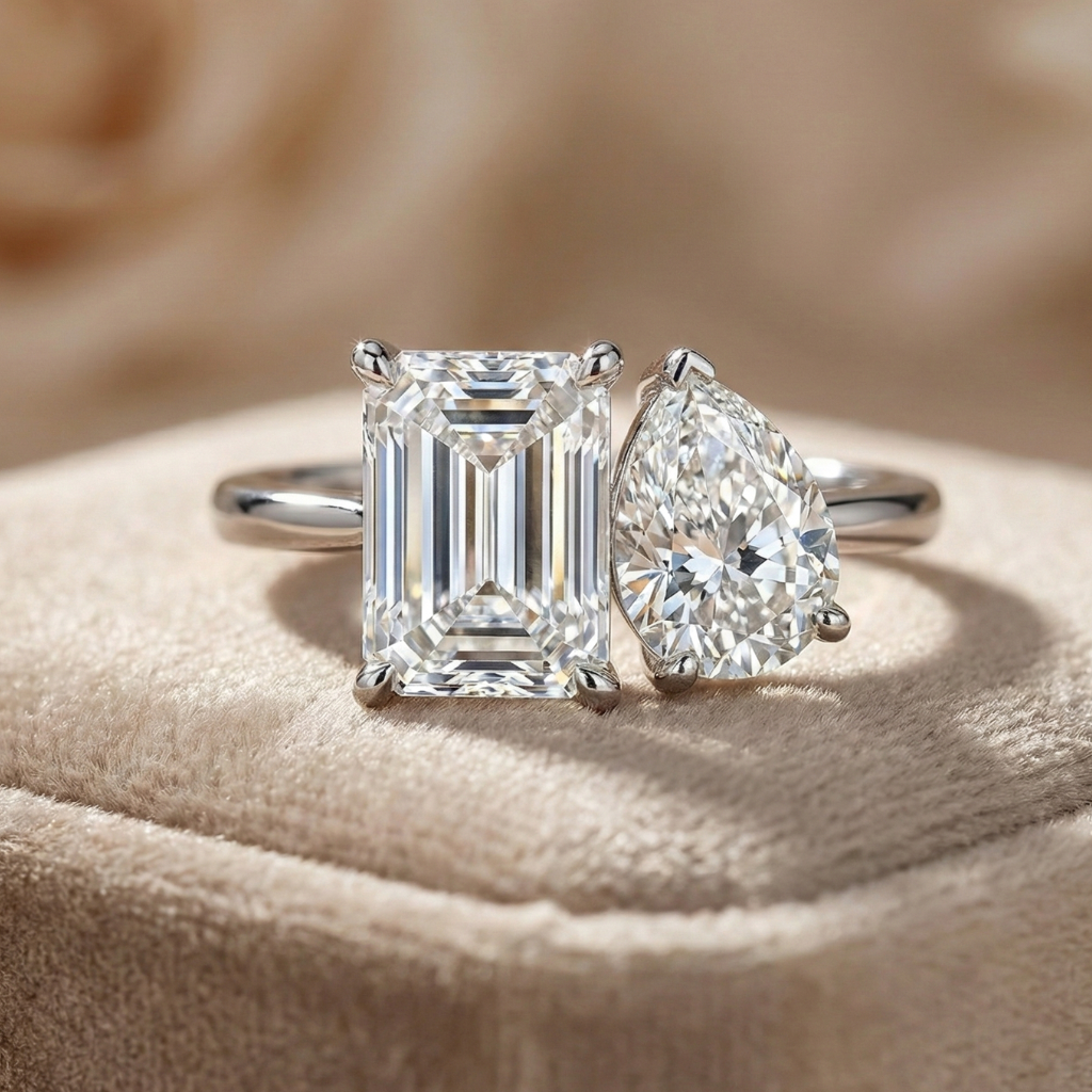 Two distinct shapes, one harmonious union. This trendsetting Toi et Moi ring features a crisp emerald-cut diamond nestled beside a graceful pear-cut stone, representing the coming together of two souls. The contrast between the step-cut clarity and brilliant curves creates a modern architectural look. It is a poetic and stylish declaration of love, perfect for the wearer who values unique symbolism.