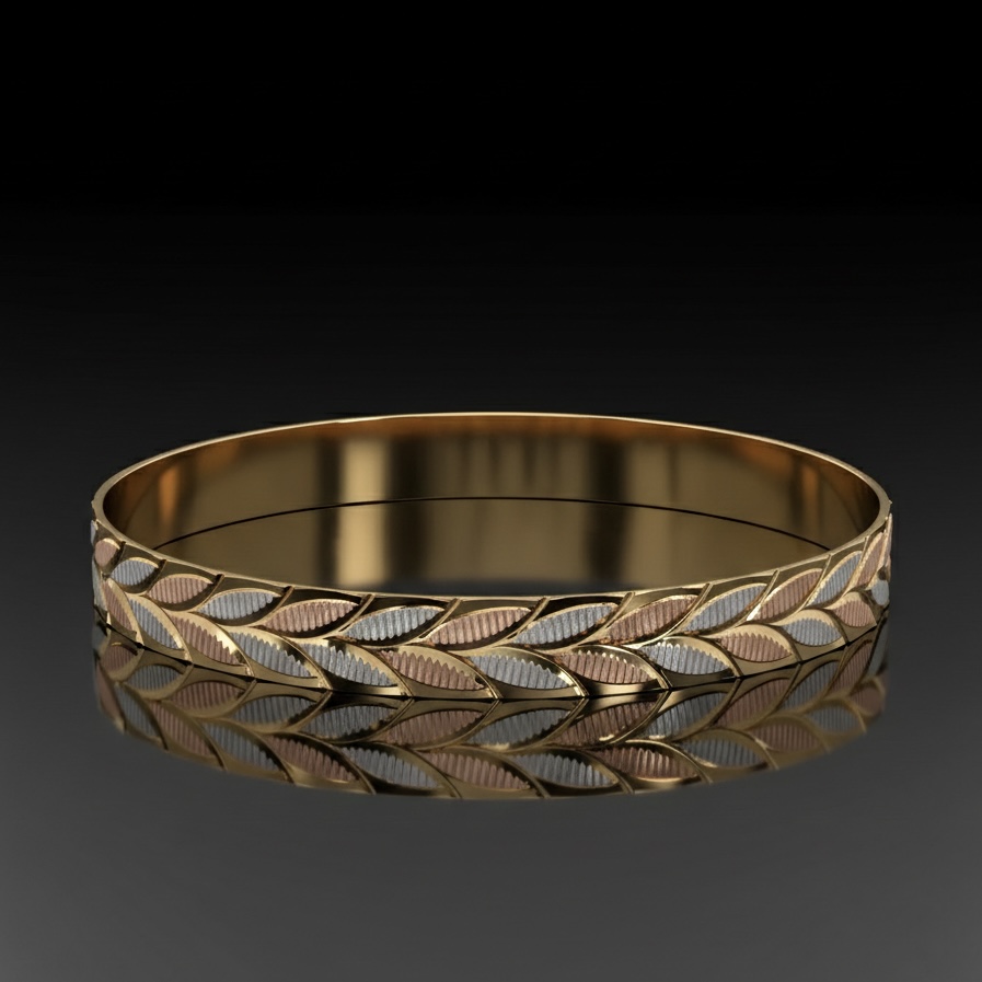 ‘Vana’ means Forest, reflecting the graceful leaf motifs. Inspired by the rustling leaves of a serene royal garden, this stunning piece showcases a repeating chevron pattern in elegant rose, white, and yellow tones. It is a harmonious blend of nature and master craftsmanship, designed for the woman who wears her art gracefully.