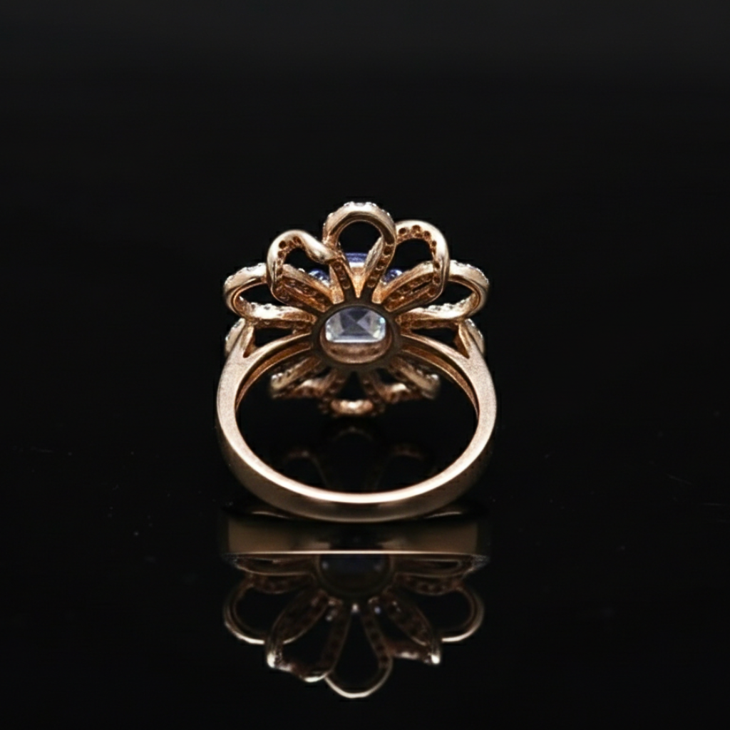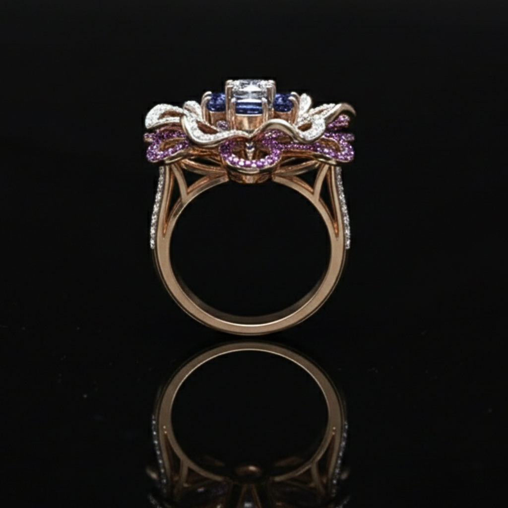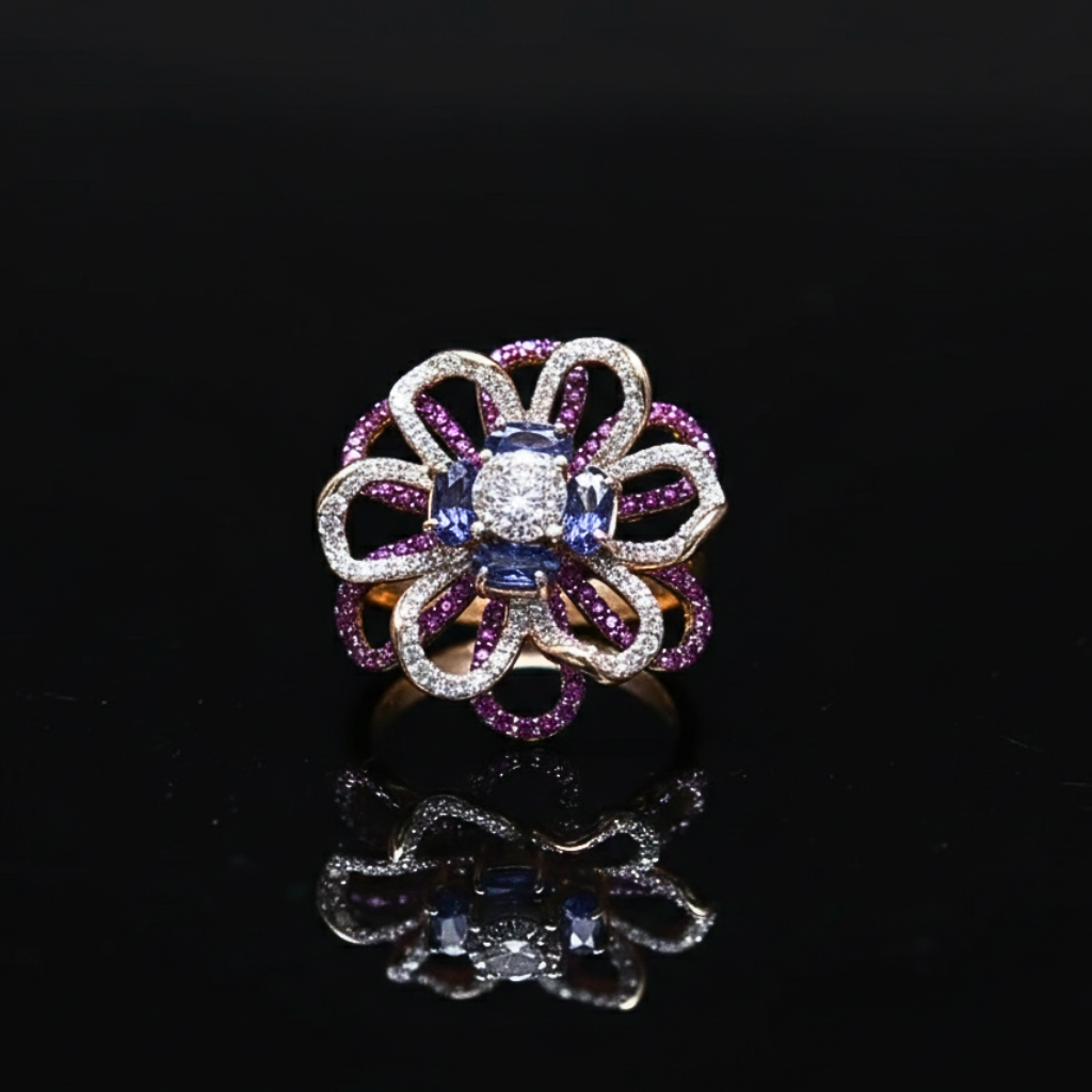 ‘Zari’ means Woven Gold Thread, perfectly matching the interlaced, ribbon-like loops. Mimicking the intricate beauty of woven gold threads, this ring intertwines vibrant gemstone loops with pure diamond accents around a luminous center. It is a joyous, festive masterpiece that wraps your finger in the colorful elegance of a royal celebration.